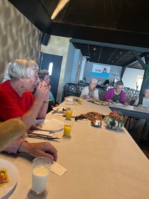 De kerk was open en we konden zelfstandig rondlopen en de fraai gerestaureerd fresco's bewonderen. helaas ontbreken de foto's van dit deel van het uitstapje van de Verzoamelstee. Daarna staken we de weg over naar Mendels. Waar we konden genieten van een lekker bakje koffie met een ruim bemeten plak cake. het was weer een gezellige ochtend.